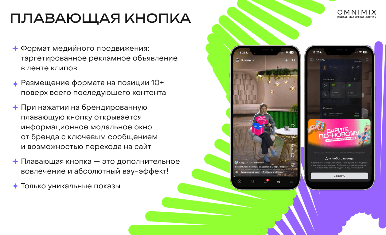 Формат плавающей кнопки относится к медийному продвижению и размещается в ленте клипов начиная с позиции 10+. Кнопка отображается поверх последующего контента и становится дополнительной точкой взаимодействия.
