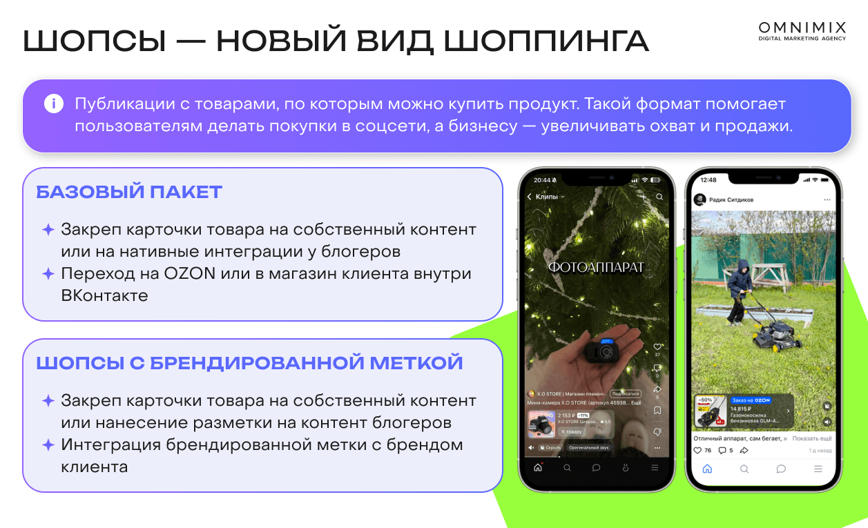 Одним из ключевых форматов на стыке контента и электронной коммерции (e-commerce) становятся шопсы. Это публикации с товарами, которые можно приобрести напрямую из клипа. Фактически VK Клипы получают функцию витрины, где видео выполняет роль упаковки продукта, а карточка товара — точки входа к покупке.