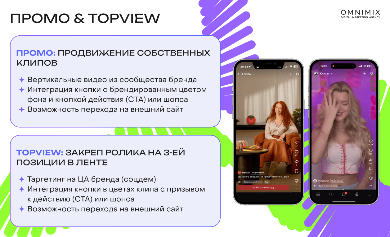 Форматы Промо и TopView решают задачу управляемого охвата внутри клипов. В случае Промо речь идет о продвижении собственных вертикальных видео бренда с возможностью интеграции кнопки — с кастомным цветом фона, призывом к действию (CTA) или шопсом, а также с переходом на внешний ресурс.