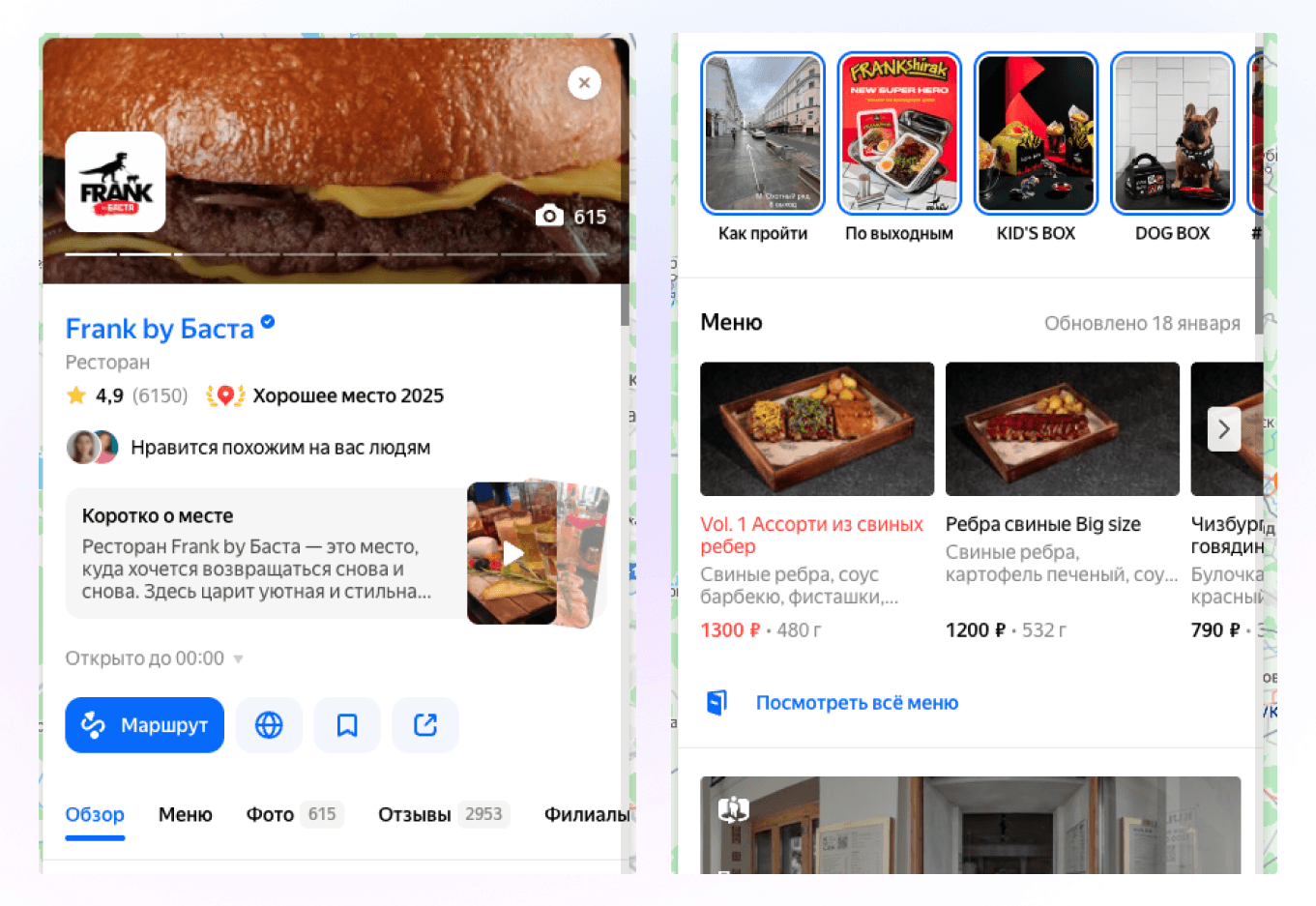 Отдельного внимания заслуживают карточки компании. В поисковой выдаче часто появляются Яндекс Карты, 2GIS и Google Карты. Если карточки не заполнены или вообще отсутствуют, это сразу минус к доверию. В них должны быть фото, описание, контакты, ссылки на сайт и соцсети, актуальное время работы, а главное — отзывы и рейтинг.