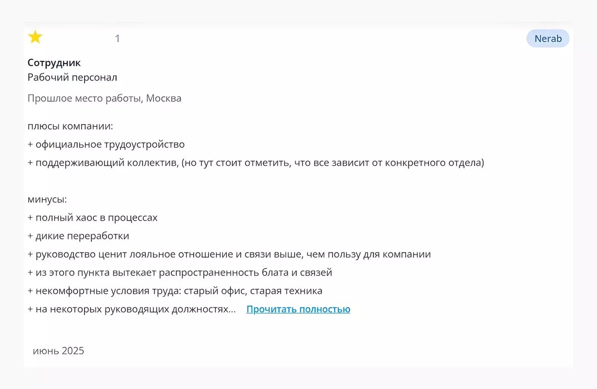Также пример из нашей практики. Крупный застройщик, хочет высокие рейтинги на карточках объектов и положительные мнения, но при этом не ведет работу с HR брендом, по которому 26% площадок в выдаче содержат негативные мнения, а 32% являются ненаполненными. Тем временем на карточке девелопера и объектов появляются негативные отзывы о работе сотрудников: «…Отличные ребята. Прекрасно не решают вопросы, не дозваниваются клиенты..», «…Прочитал здесь про замечательную работу клиентских менеджеров и решил поделиться своим негативным опытом…», «…Уж не знаю: или это некомпетентность клиентской службы, или это у них вся работа специально так построена, но ощущения максимально неприятные. Теперь и не знаю - стоит ли вообще у них покупать....»