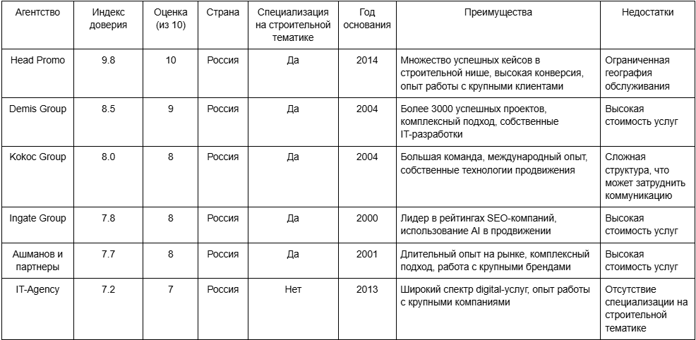 Важность выбора правильного SEO-агентства для строительной компании трудно переоценить. Качественная SEO-услуга обеспечит не только повышение позиций в поисковой выдаче, но и стабильный рост лидов с органического трафика. Рассмотрим лучшие агентства, которые специализируются на продвижении сайтов строительных компаний и предлагают комплексный подход к решению задач.