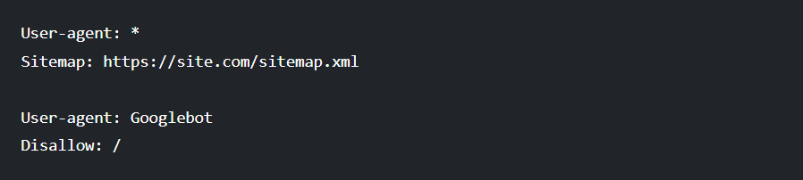 Мы указали sitemap для всех поисковых роботов, но это не будет разрешающей или запрещающей командой. Из-за этого правила User-agent объединяются в единую группу, а это значит, что сканирование сайта окажется закрыто не только для Googlebot, но и для всех остальных поисковиков.