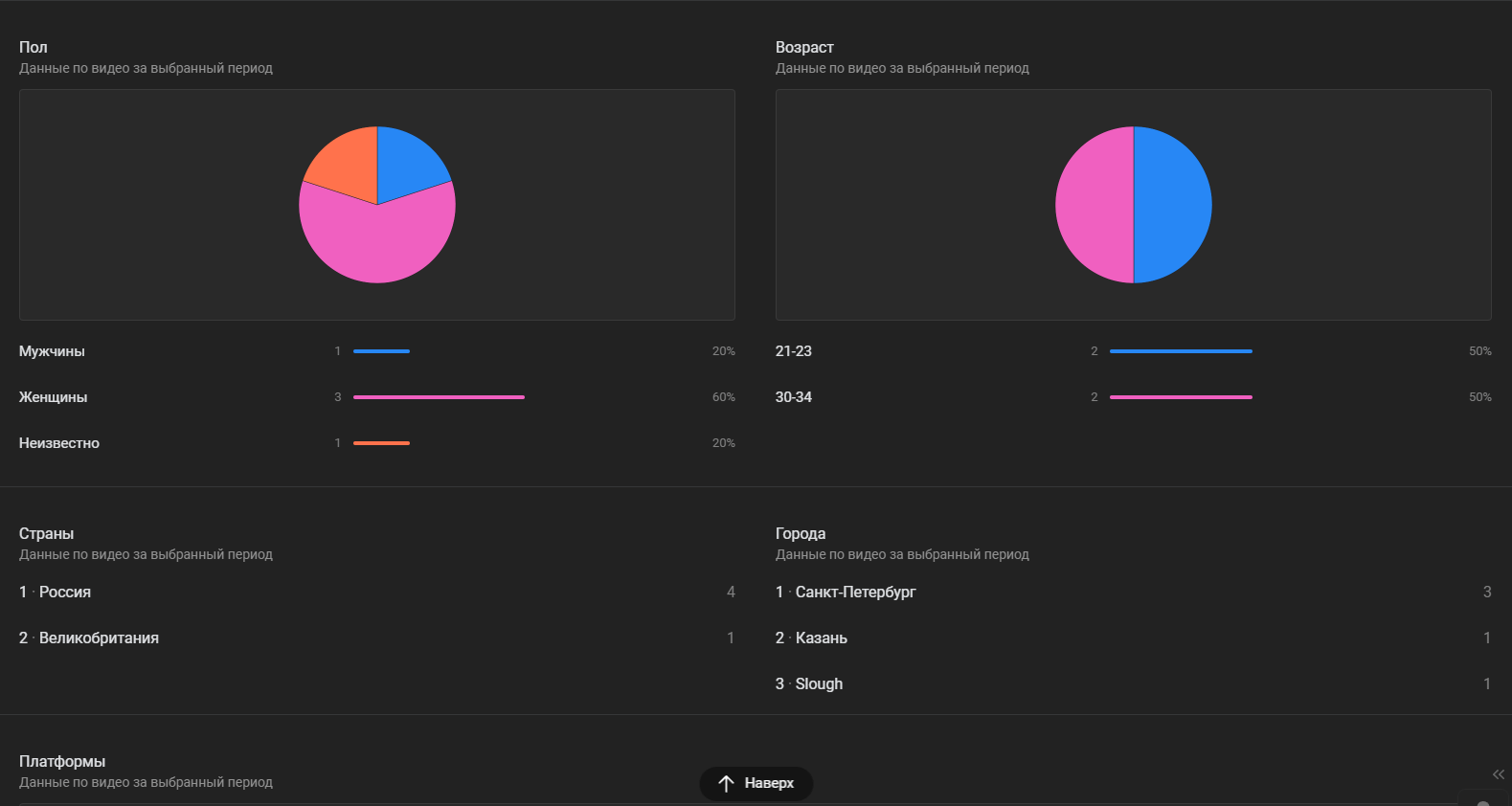 В разделе «Мои видео» находится та же инфа, но мы можем опуститься ниже и узнать пол/возраст, страну и платформу, с которой смотрели видео.