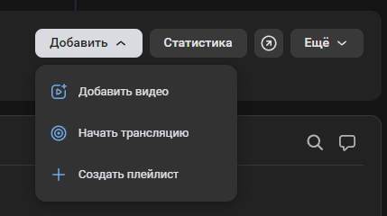 (видосы также можно добавлять сверху слева, над разделами находится 2 кнопки «видео» и «эфир»)