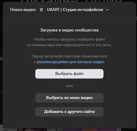 Еще один минус, хотя это может быть связано с малым количеством просмотров. Наш канал в VK Видео называется «UXART | Студия интерфейсов», да-да, мы завели здесь аккаунт для репостинга.