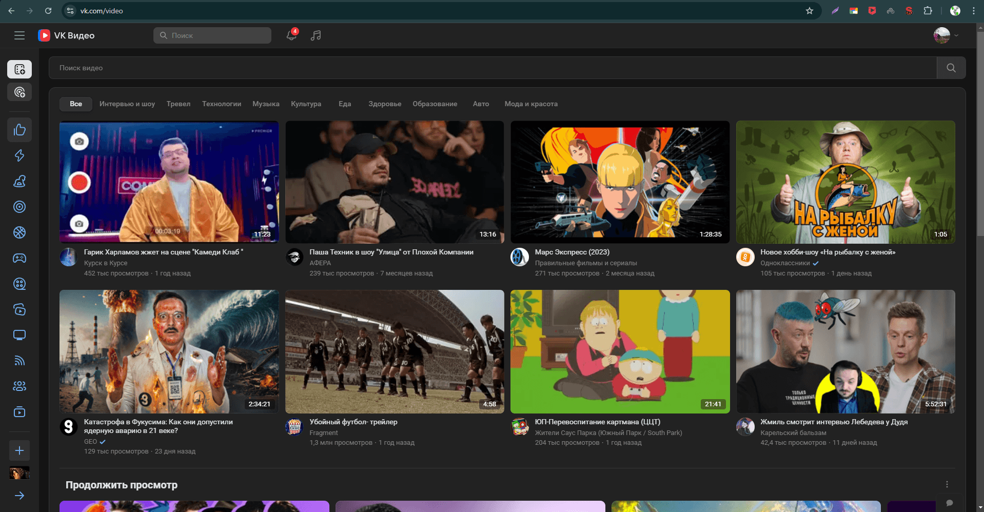 Сервис встречает нас классическим набором видосов на разные темы. Здесь нет акцентных видосов, как это было у Rutube. Весь контент равномерно распределен по странице — по 4 видоса в ряд.