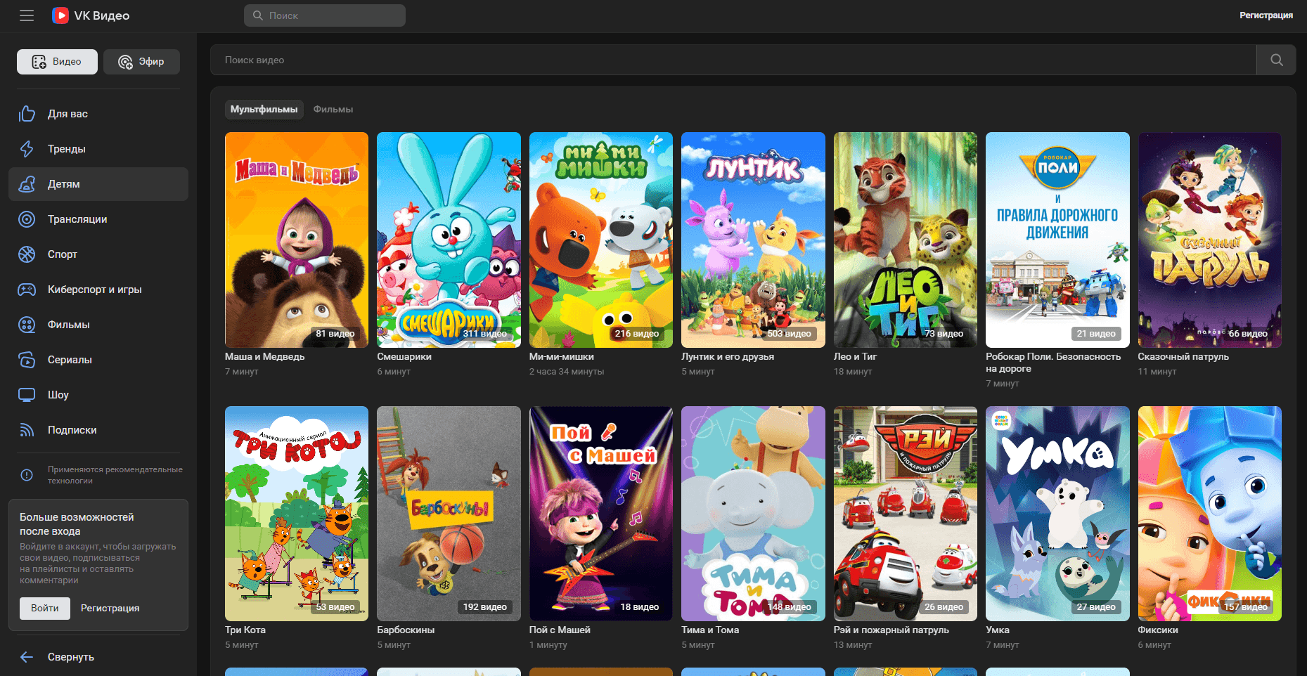 По сути своей — просто сборник мультиков и фильмов, которые можно смотреть детям. Хорошо, что они вывели эту категорию в отдельную вкладку. В отличие от Rutube, где мультики и фильмы показаны прямо на главной.