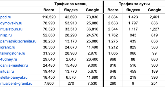 Самые важные данные — сами сайты и трафик, который они приносят. Добавляем конкурентов в одну табличку и суммируем трафик по каждому сайту из Яндекса и Google. Так как сервис показывает данные по трафику за сутки, для получения данных за месяц, умножаем трафик на 30.