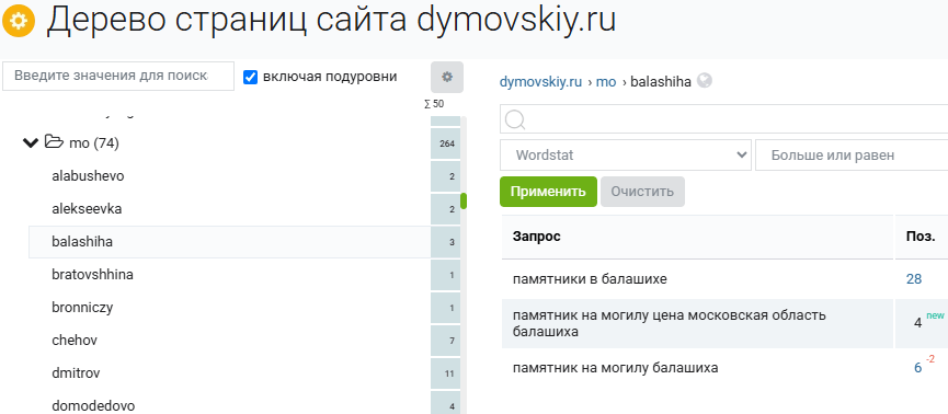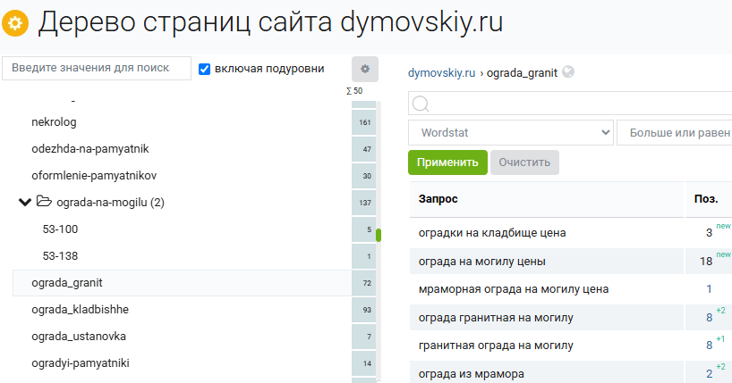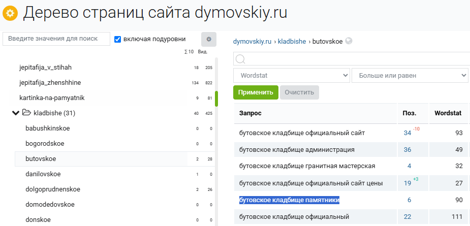 Просматриваем структуру и, например, по папке kladbishe видим, что на сайте dymovskiy.ru созданы страницы, связанные с кладбищами. Замечаем запрос «памятник бутовское кладбище». Сайт по этому запросу хорошо ранжируется — на 6-й позиции. Предполагаем, что люди заказывают памятники на разные кладбища, это может стать одной из точек роста.