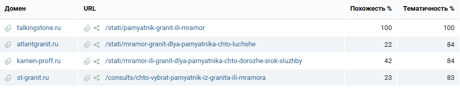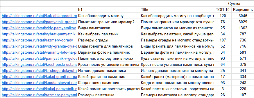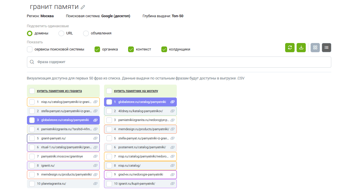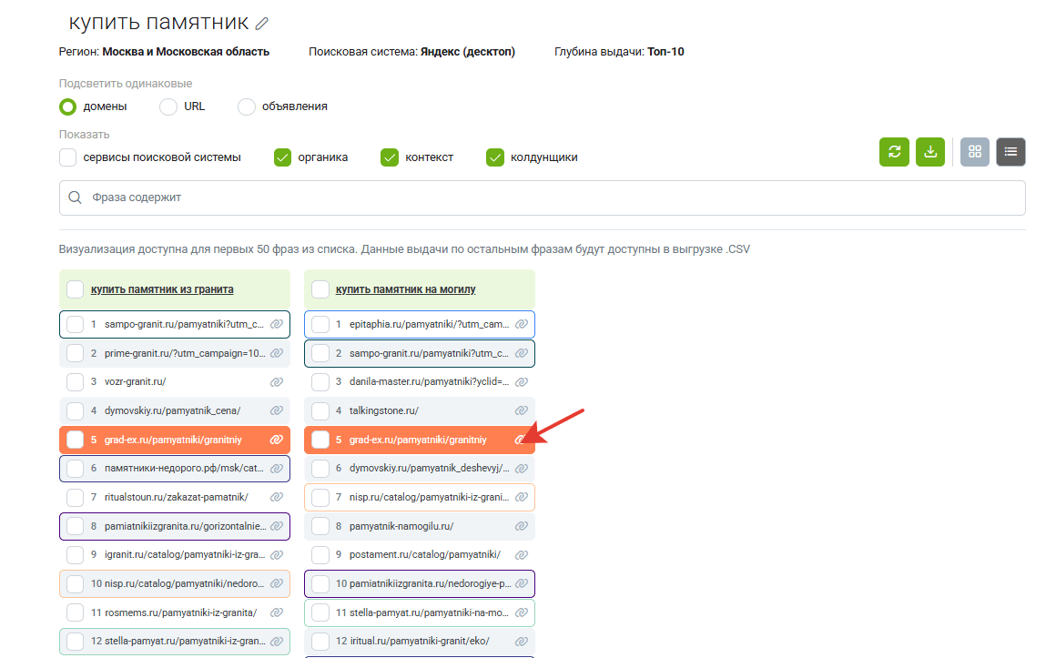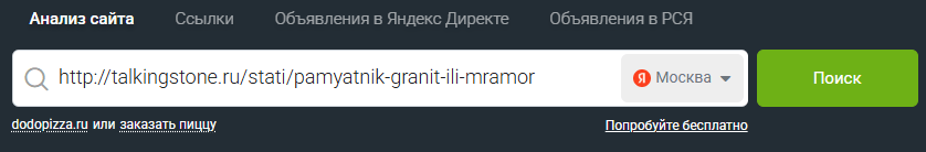Например, мы выбрали запросы «купить памятник на могилу» и «купить памятник из гранита». Подобрали сайт, который есть в топ-10 Яндекса по Москве по этим запросам.