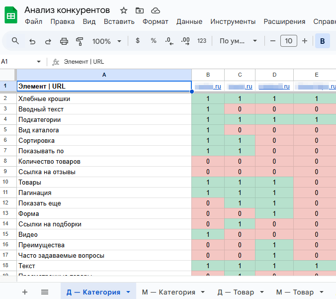 Рассматриваем разные типы страниц: главную страницу, страницу категорий и страницу товаров. Также анализируем сквозные элементы, такие как шапка и подвал. Выделяем все элементы и ставим 1, если он есть на конкретном сайте, или 0, если такого элемента нет. Можно дополнительно проанализировать отдельные элементы, например, пункты в фильтрах у конкурентов.