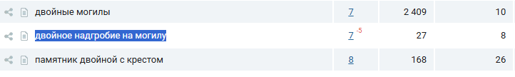 Далее можно поискать ключевые фразы, о которых мы не догадывались. Например, есть страница «двойные памятники на могилу». Среди неочевидных запросов: «двойное надгробие на могилу», «сдвоенный памятник на могилу».