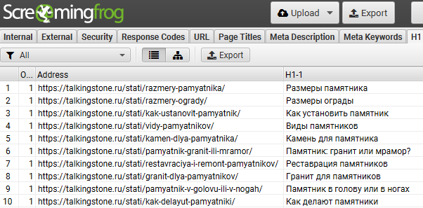 Можно подтянуть дополнительные данные, например, H1 и Title, воспользовавшись сервисом для парсинга Screaming Frog.