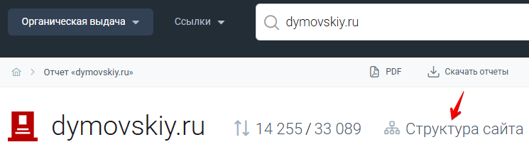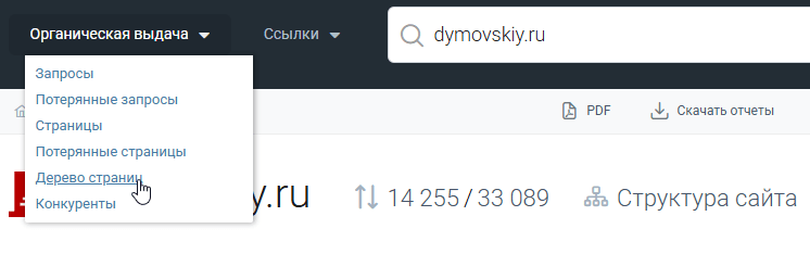 Открываем раздел «Органическая выдача» — «Дерево страниц» или нажимаем на кнопку «Структура сайта».