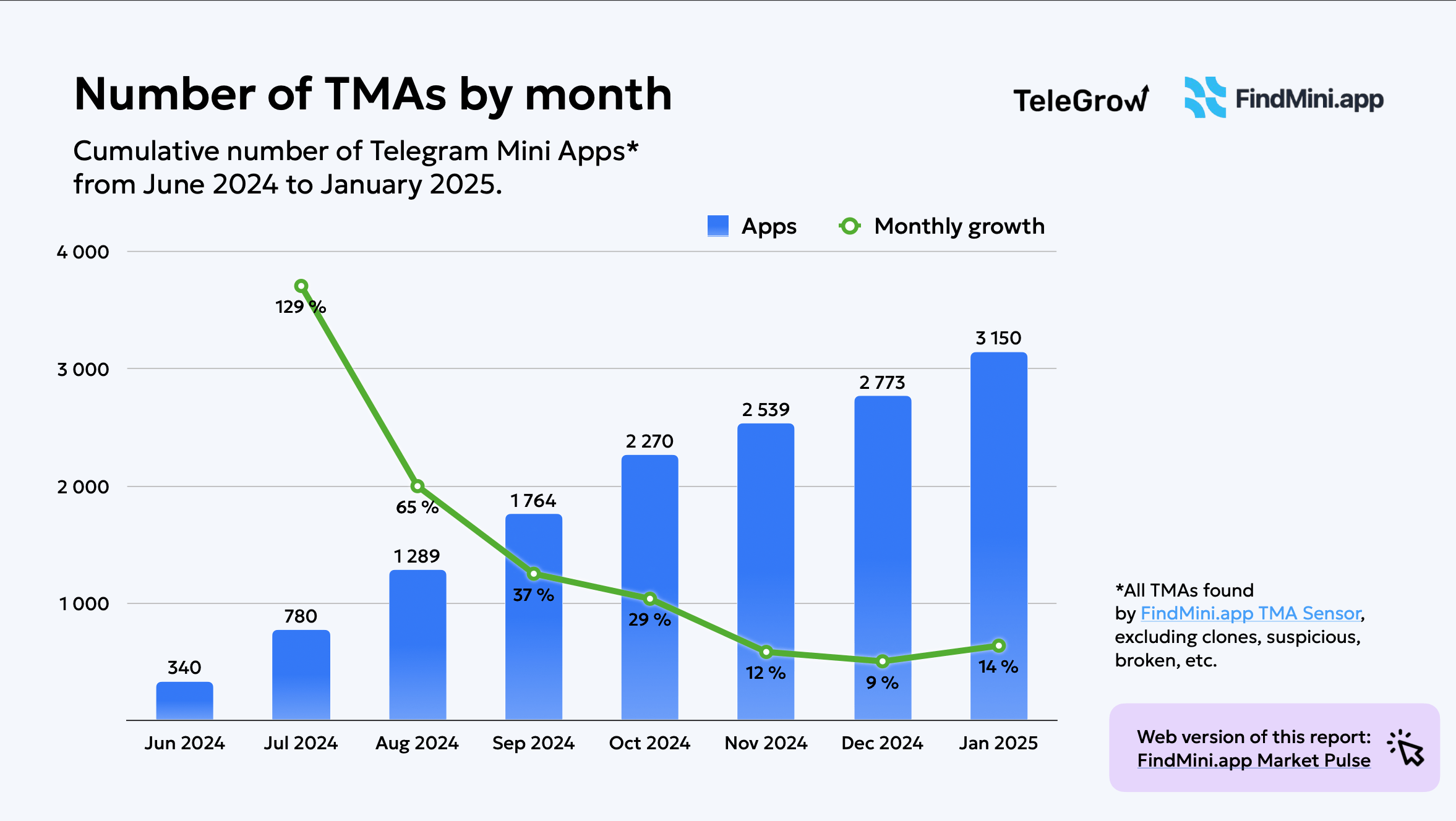В январе 2025 года, общее количество мини-приложений, найденных FindMini.app, составило 3150. Всего год назад это число составляло 340 штук. Это говорит о растущем интересе аудитории Telegram к мини-аппам.