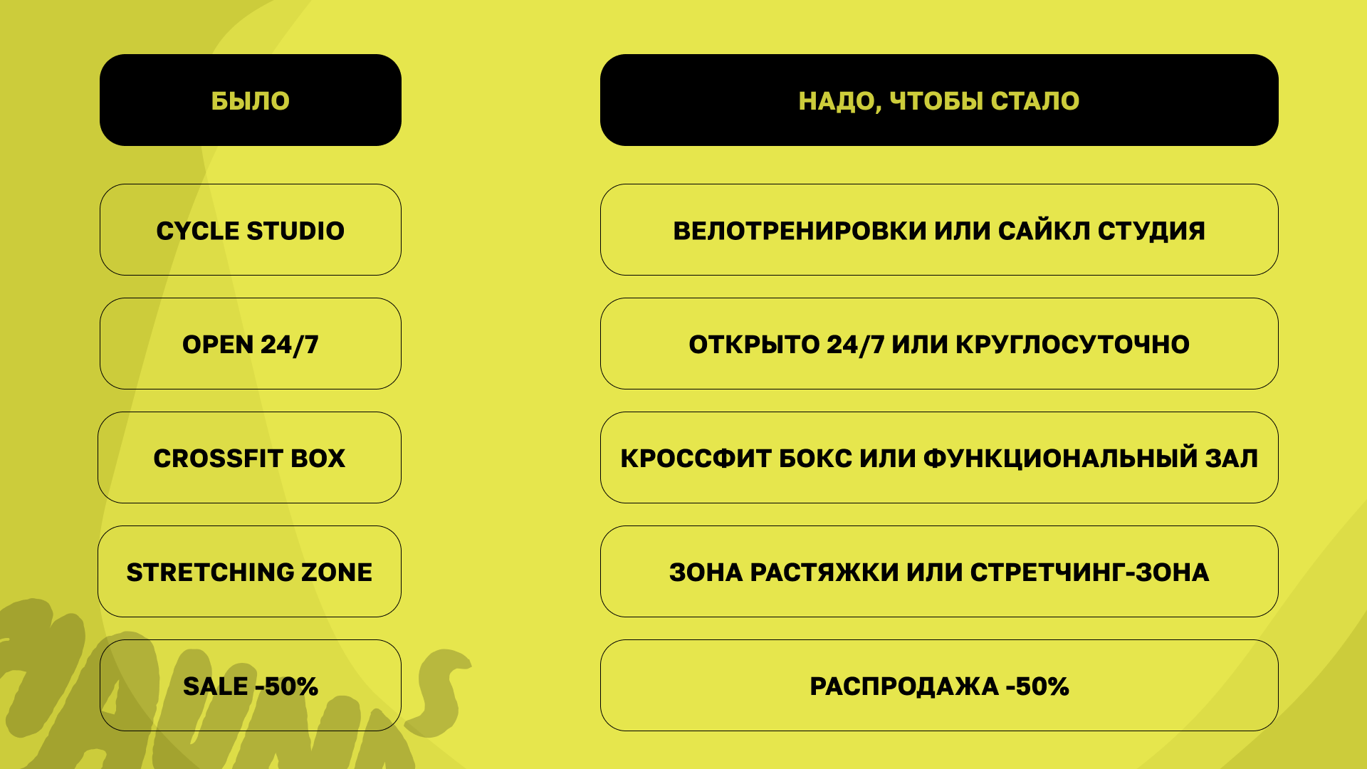 Не важно, насколько красиво звучит ваше «Cycle Studio» — если оно не зарегистрировано как товарный знак, пишите «Сайкл Студия» или добавляйте «Студия велотренировок».