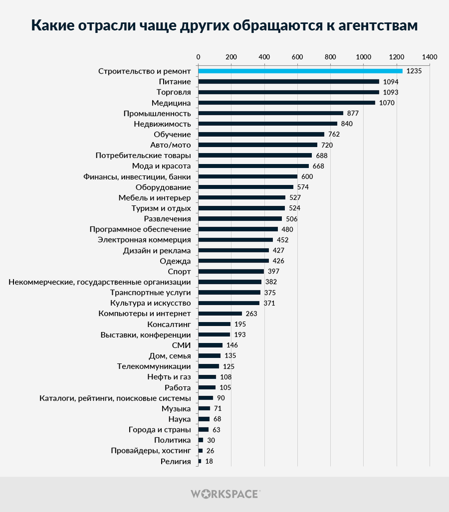 Обработав данные с 2016 года, в Workspace выяснили, что чаще всего к диджитал-агентствам обращаются заказчики, представляющие отрасль «Строительство и ремонт». Второе место поровну поделили «Питание» и «Торговля». Данная информация может представлять особую ценность для агентств, которые еще вырабатывают свое УТП и специализацию на конкретных нишах.