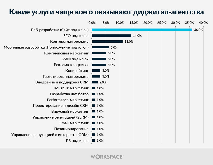 Специалисты сервиса Workspace, объединяющего заказчиков и исполнителей услуг в сфере диджитал, провели исследование, базирующееся на выборке из 18+ тыс. компаний и 19+ тыс. кейсов. Цель анализа — понять лучше структуру агентского рынка Рунета и выявить закономерности. Представляем вам его результаты.