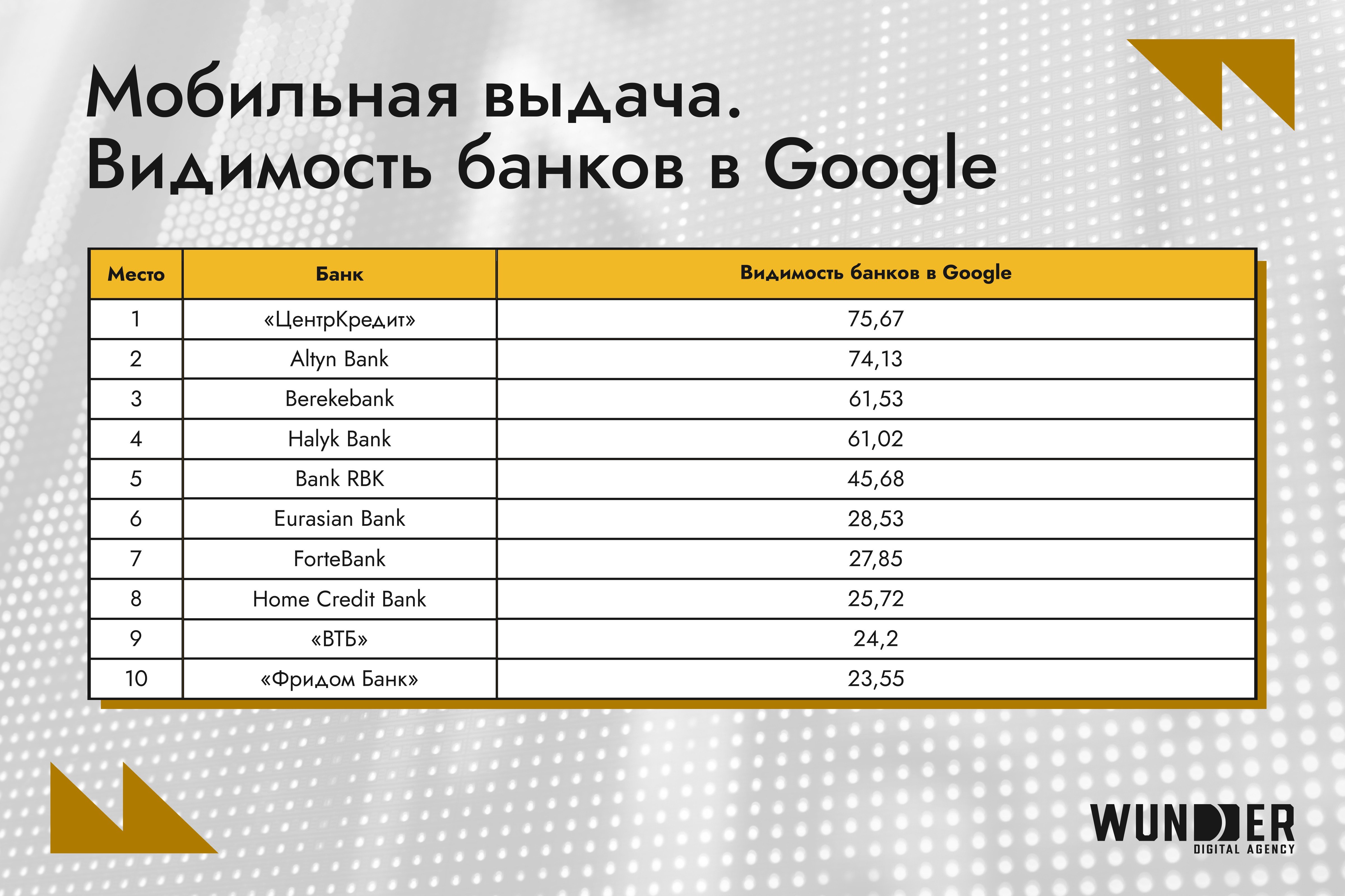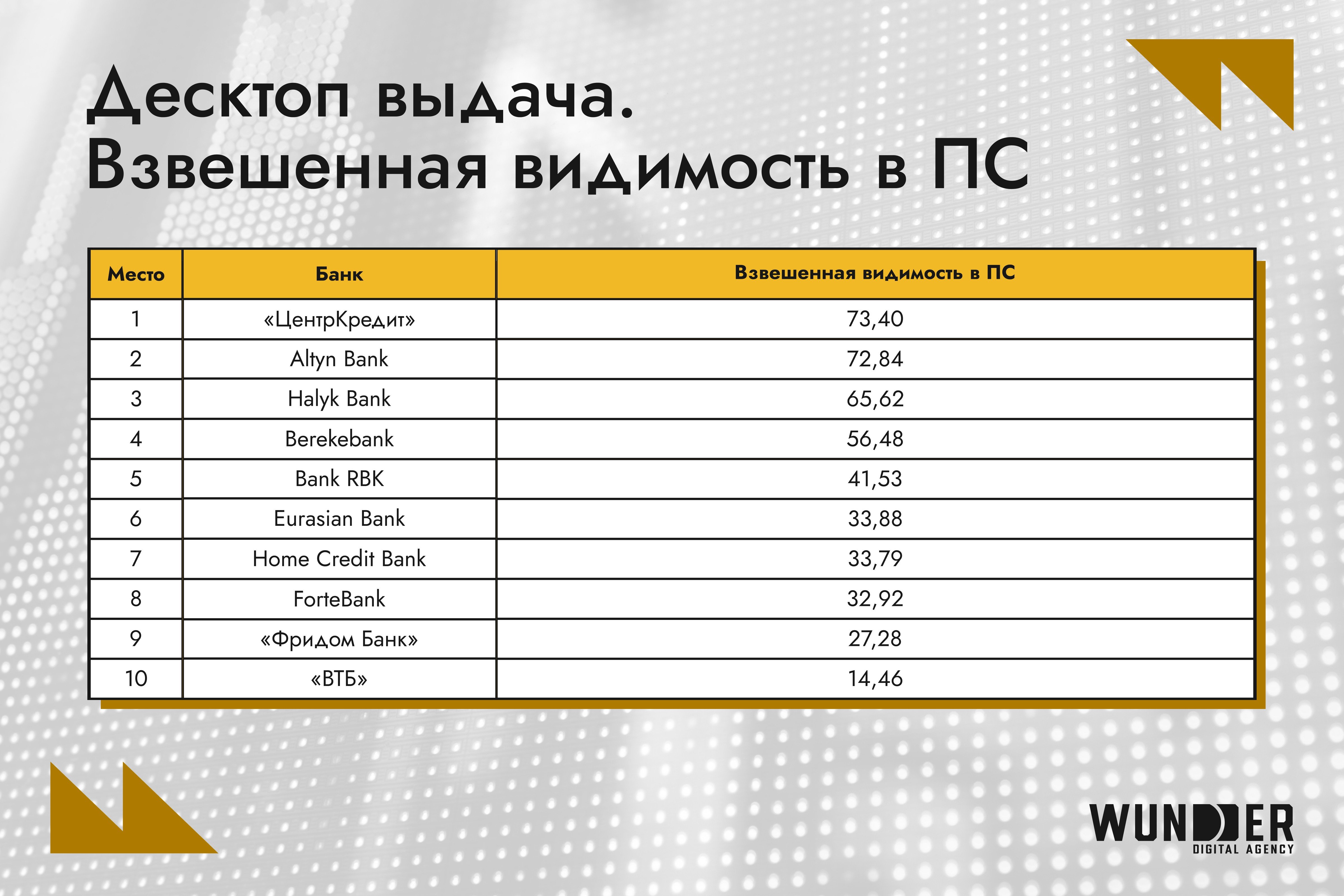В обновленном исследовании инновационный digital-хаб Wunder Digital проанализировал видимость 18 крупнейших банков Казахстана сразу на двух типах устройств – десктопах и смартфонах – и сравнили, как меняются позиции игроков. Такой подход поможет им понять, где именно происходит просадка, чтобы точечно усилить слабые места.