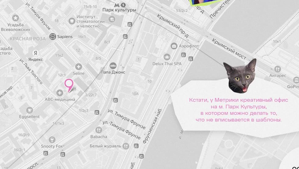 Локация офиса на картах смотрится скучновато. Поэтому вот вам лайфхак: Берете мемные фотки кота коллеги, делаете из них стикеры. Вуаля — вы оживили карты и расположили пользователей к себе.