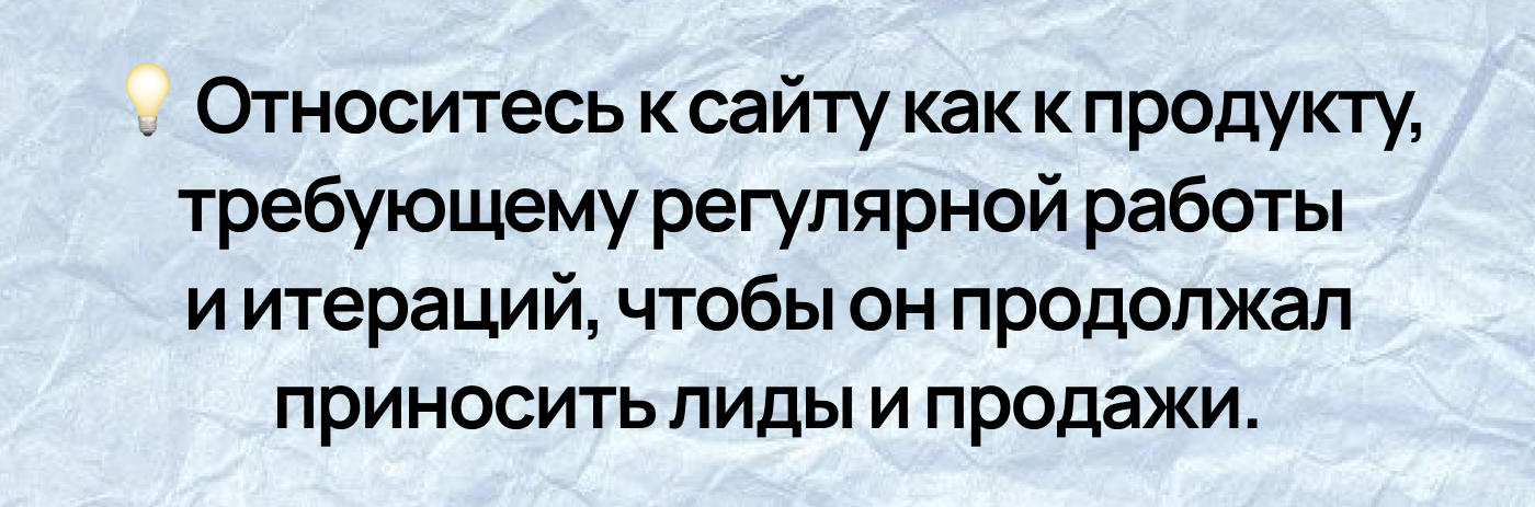 Как мы уже написали выше, сайт — это живой продукт, который требует постоянного развития. Без понятного плана улучшений он быстро устаревает и перестает приносить результаты.