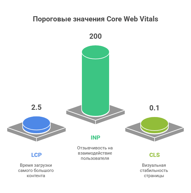 С марта 2024 года Google оценивает при ранжировании не только скорость клика (FID), но и общий отклик страницы. Новый параметр называется Interaction to Next Paint (INP). В идеале загрузка основного блока (LCP) должна быть до 2,5 сек, отклик на действие (INP) до 200 мс, «дрожание» элементов (CLS) не выше 0,1⁶.