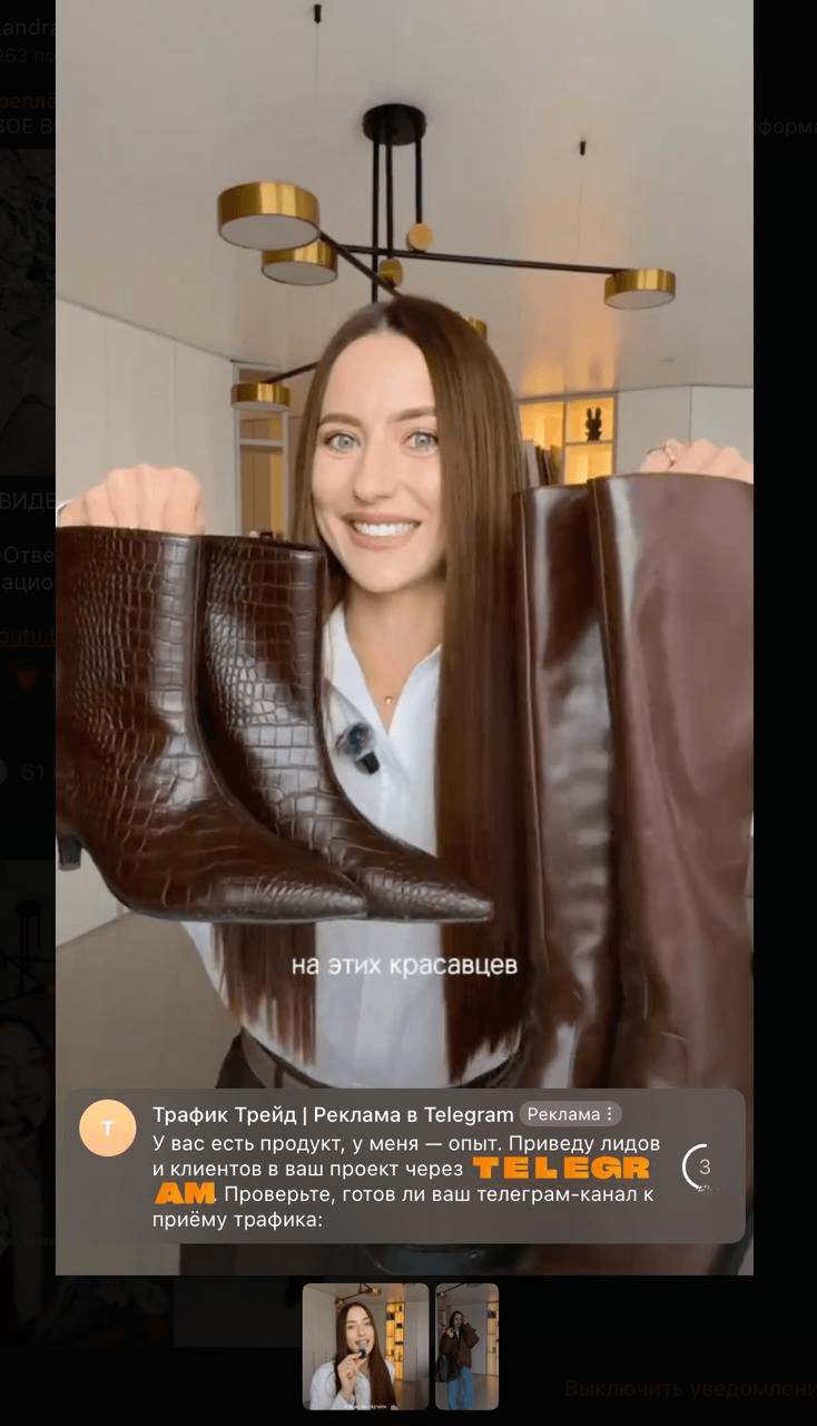 Использовать видео, где спикер что-то говорит без субтитров — большая ошибка. Реклама в Telegram по умолчанию идет без звука. Пользователь ленив, и он не станет нажимать на видео, чтобы его скачать и дождаться загрузки со звуком.