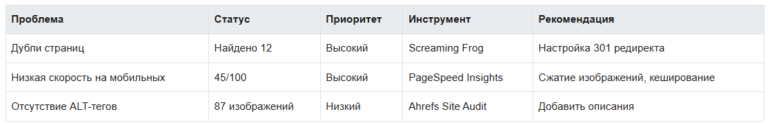Важно: перед началом аудита полезно создать «моментальный снимок» сайта — сохранить текущие версии ключевых страниц, сделать экспорт всех метаданных и выгрузить топовые поисковые запросы. Это позволит позже измерить эффект от внесённых изменений и не работать вслепую!