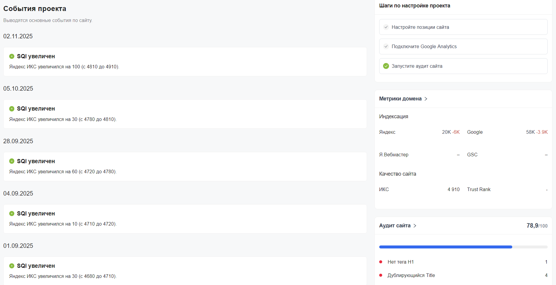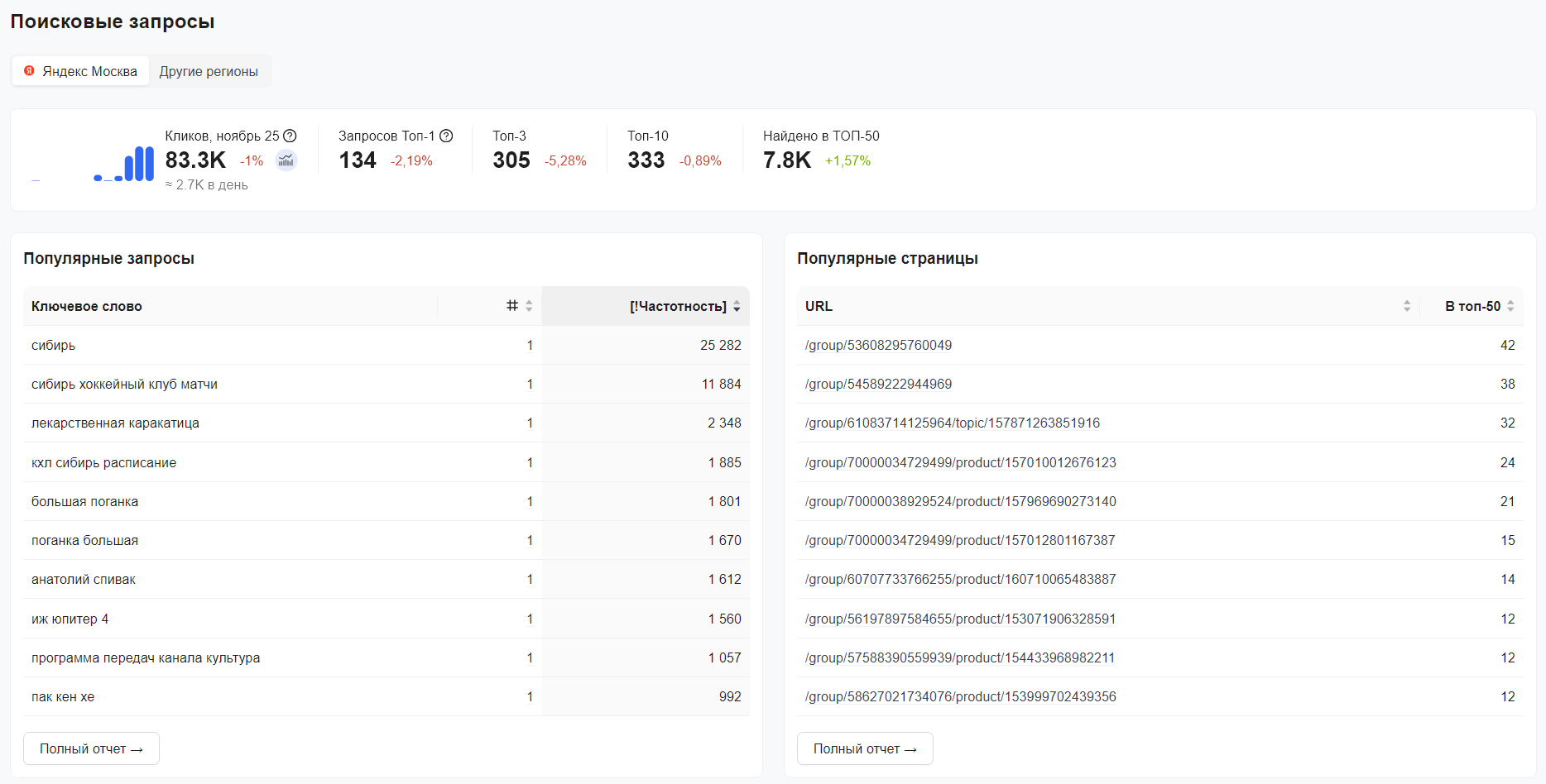 В сервисе «Анализ сайта» можно посмотреть список популярных страниц и главные запросы, по которым на ваш сайт приходит органический трафик.