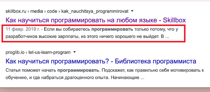 В поисковой выдаче описание отображается под заголовком. Именно благодаря ему читатель понимает, нужно ли ему читать данную статью: