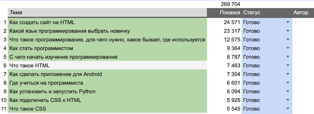 По результатам такого сбора можно получить список тем, который практически не отличается от обычного редакционного темника. Разница лишь в том, что редактор может заранее ориентироваться в количестве показов, которых стоит ждать от той или иной статьи.