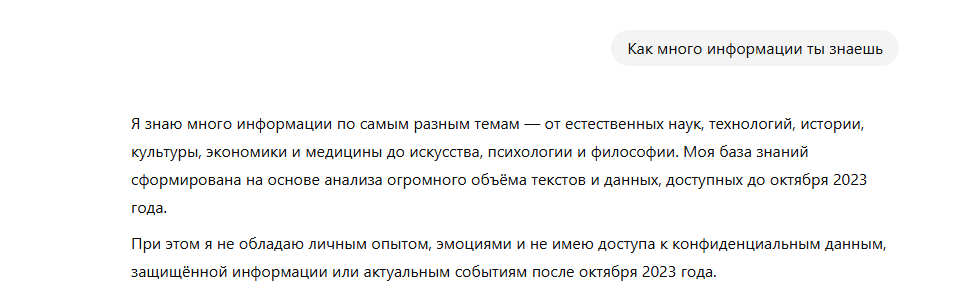 Именно поэтому при работе с текстами от GPT и его аналогов не обойтись без ручной вычитки и редактуры контента. Кстати, этот момент актуален не только там, где речь идет о деньгах или заботе о себе. Например, тексты нейросетей по туристической тематике часто содержат ошибки в названии, местоположении и времени работы различных достопримечательностей. И если человеку всё равно придется заходить на сайты всех музеев, нацпарков и курортов, чтобы узнать точную информацию, то не проще ли написать качественный текст с нуля, а не вносить правки в каждое предложение?