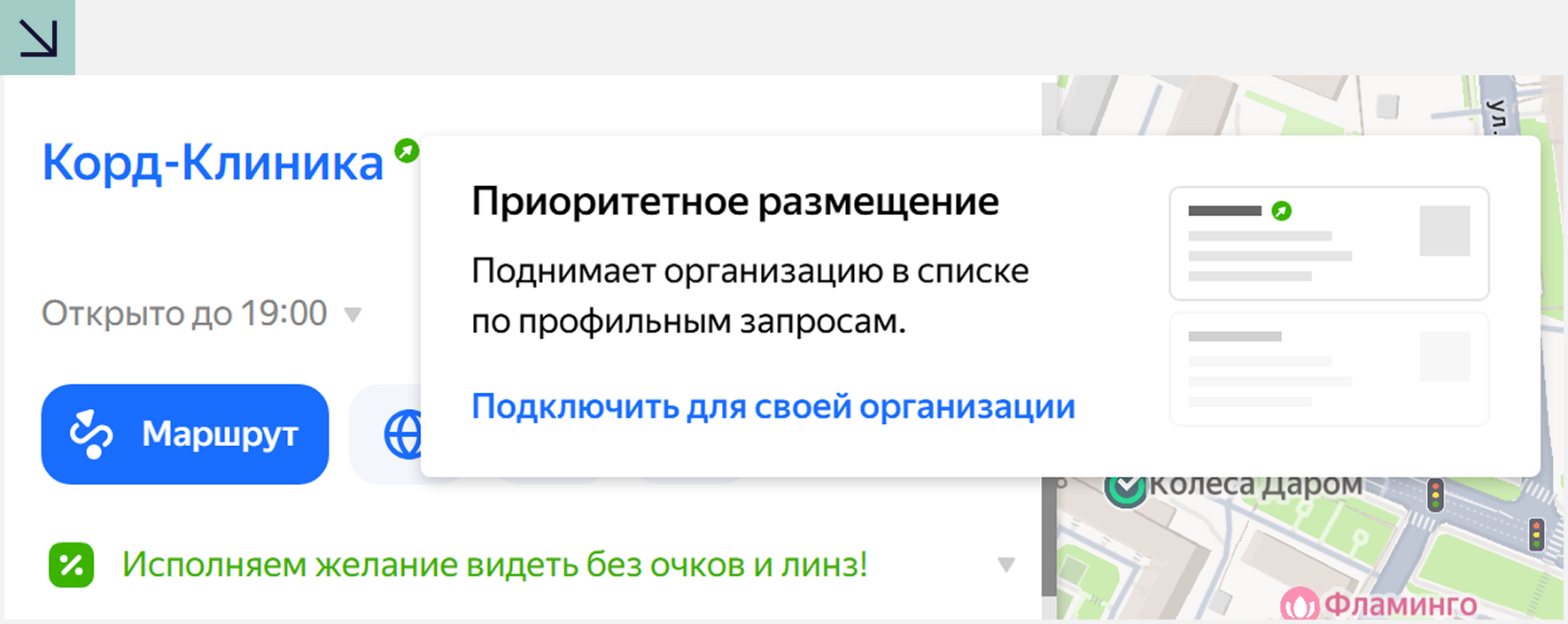 Проверка: Используют ли лидеры выдачи в вашем районе приоритетное размещение (рекламную подписку)? Наличие «зеленых меток» у конкурентов сигнализирует о высокой плотности аукциона за внимание пользователя.