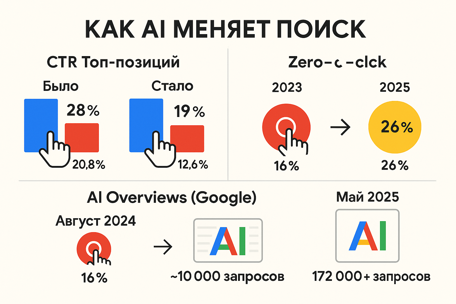 Доля zero-click выросла до 26%. Каждый четвертый пользователь завершает поиск без переходов на веб-ресурсы. Потому что получает нужную информацию от нейросети. По сути, начальное впечатление о бизнесе формируется до перехода и вне вашего сайта. Для отдела продаж это прямая потеря контактов.
