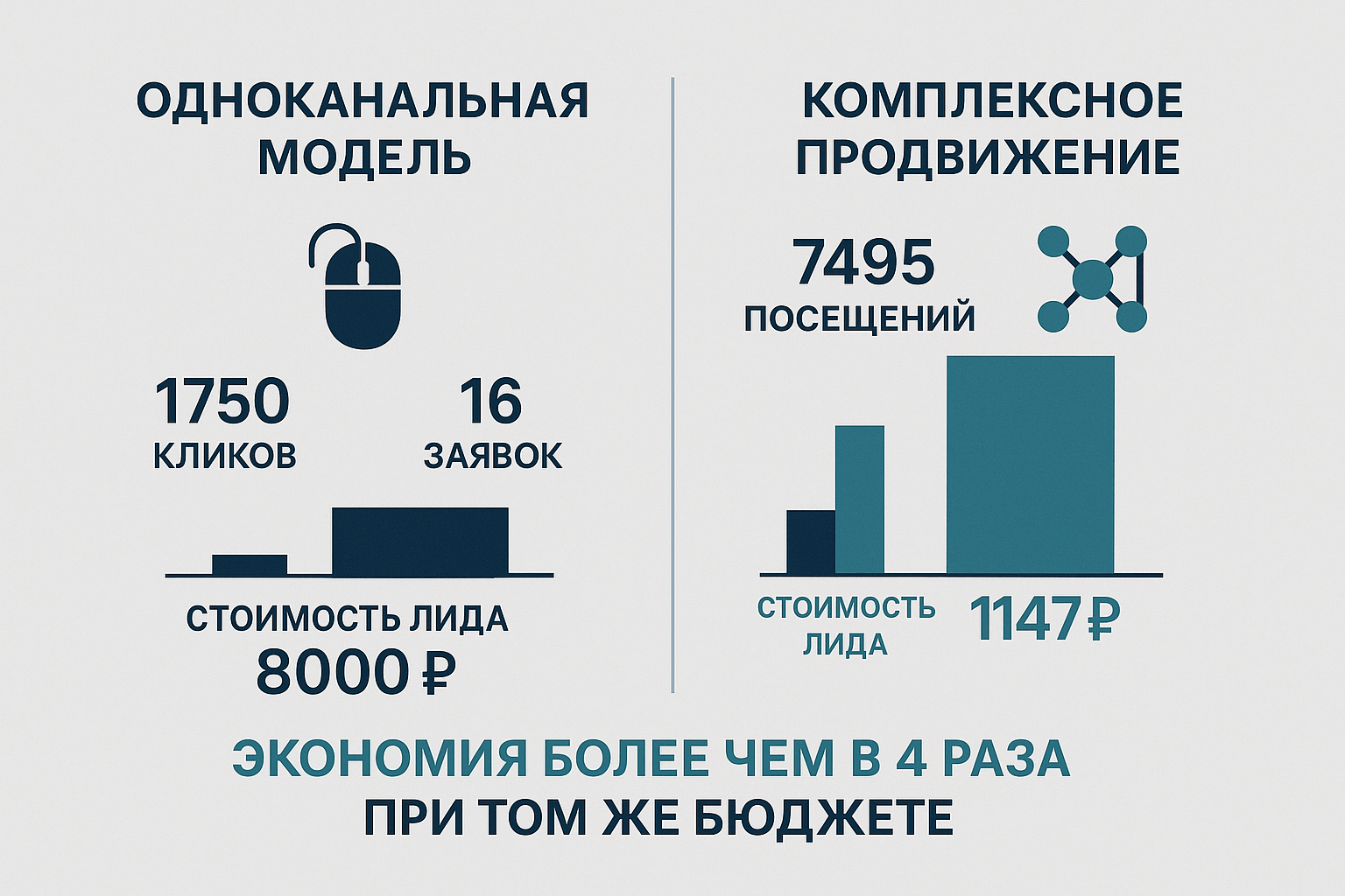 Для бизнеса это сигнал, что использование только одного канала превращает продвижение в игру на удачу. А оно должно быть управляемой системой, где работает каждый рубль. Только в таком случае маркетинговая стратегия становится эффективной, рост компании предсказуемым, а бюджет не раздувается из-за роста ставок и колебаний спроса.