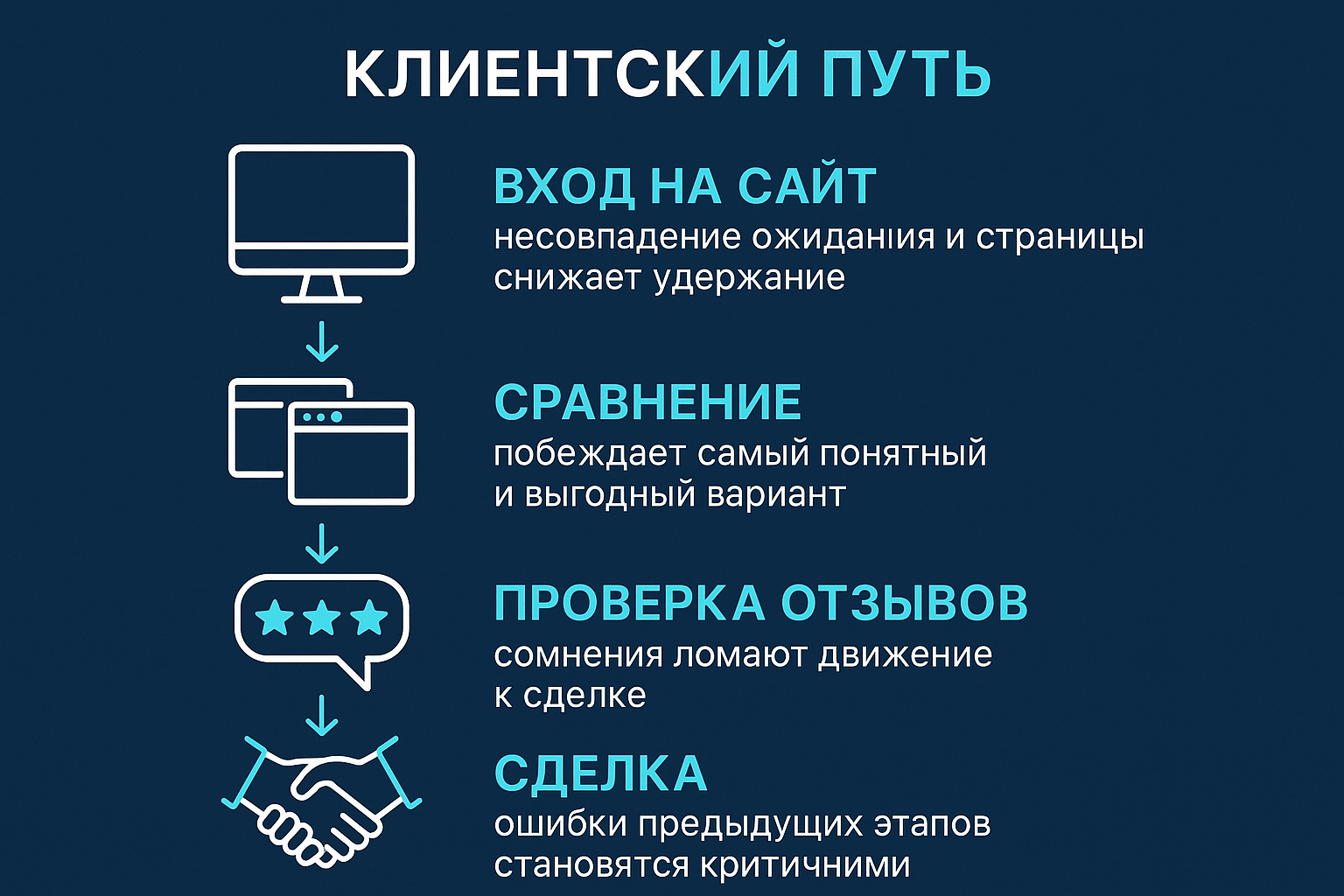 Для устойчивого продвижения бизнеса важно смотреть на весь путь пользователя. Человек принимает решение не глядя на баннер, в выдачи поисковых систем, а непосредственно на сайте. Любой разрыв в воронке продаж делает продвижение дороже, независимо от того, как качественно настроена контекстная реклама или SEO.