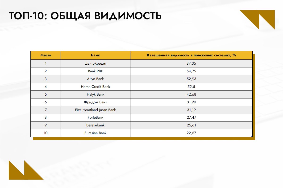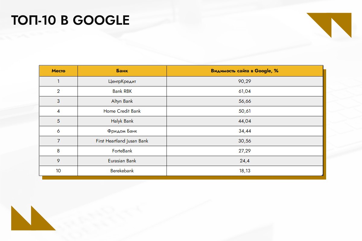 В ноябре «ЦентрКредит» укрепил свое лидерство, увеличив видимость в Google с 88,21% в июле до 90,29% (+2,08%). Bank RBK сохранил второе место, показав рост с 59,48% до 61,04% (+1,56%). Третью позицию занял Altyn Bank, совершив скачок с восьмого места – видимость увеличилась с 35,93% до 56,66% (+20,73%).