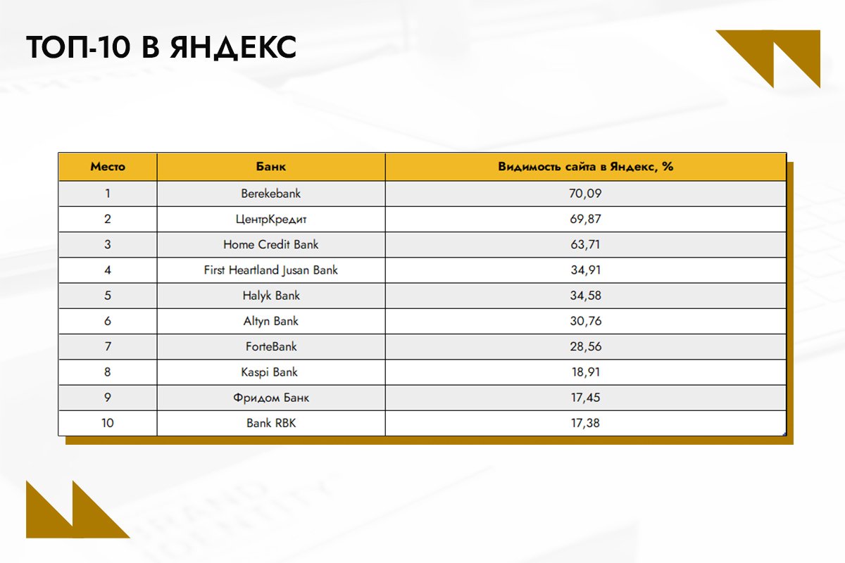 На четвертое место поднялся First Heartland Jusan Bank, улучшив видимость с 19,98% до 34,91% (+14,93%). В топ-10 также заметен рост у ForteBank, который увеличил показатель с 17,39% до 28,56% (+11,17%). Значительное снижение показателей у Bank RBK: он переместился с четвертого места на десятое, потеряв -17,35% видимости (с 34,73% до 17,38%). Kaspi Bank – с пятого места (34,23%) на восьмое (18,91%), с ухудшением по видимости в Яндекс -15,23%.