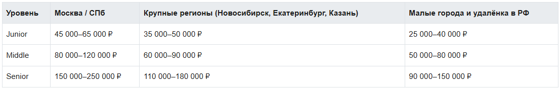 Таблица диапазонов зарплат по уровням и регионам (Россия, 2025 г.):