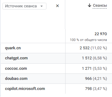 Первым делом стоит следить за трафиком с внешних ссылок, ведущих с платформ на основе ИИ. Один из главных источников —chatgpt.com (ChatGPT). Если вы работаете на зарубежную аудиторию, в Google Analytics можно заметить и другие домены: например, Perplexity, Claude.ai, Bing и др.