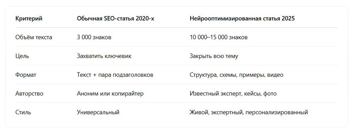 Это значит: если на сайте нет экспертного и подробного контента, ваш сайт не попадёт в "нейроподборку". Нейросеть ищет не просто ключевые слова, а суть и авторитетность.