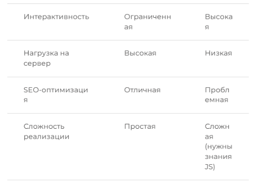 ❌ Более медленная загрузка страниц для новых пользователей, так как браузеру нужно сначала скачать JavaScript и обработать данные.