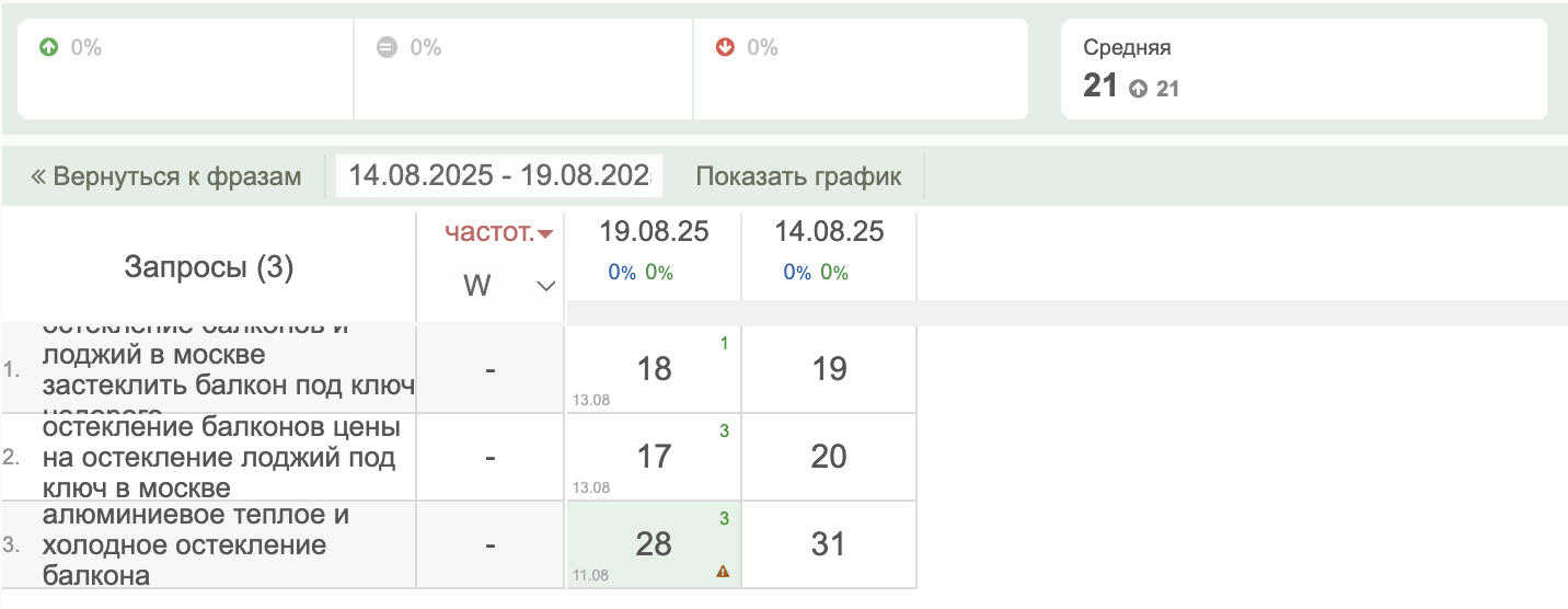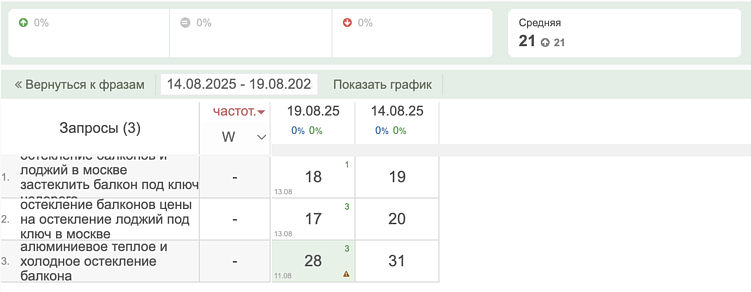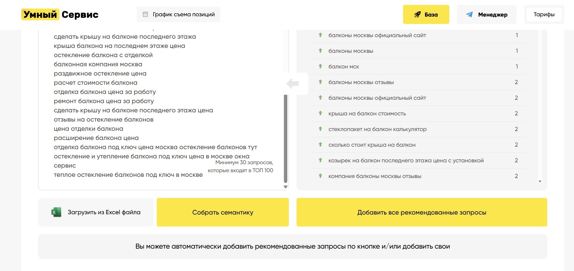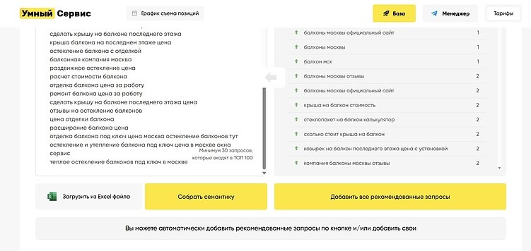 Тестовый период составлял 5 дней. Удобство заключалось в том, что можно было регулировать вручную запросы, а также что для расширения семантики был целый столбец со схожими запросами. Можно было выбрать из всех предложенных запросов и запускать тест. Я внесла 40 запросов, среди которых было три основных, отобранных изначально.