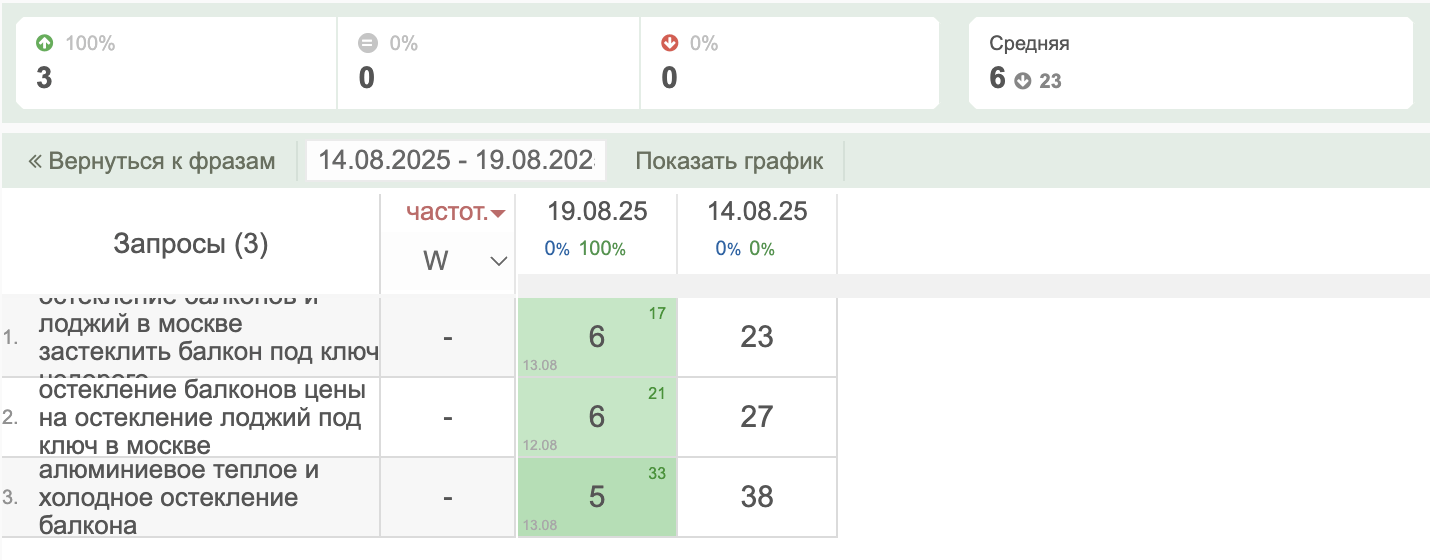 Зафиксировала позиции сайтов 14.08.2025 и распределила их между сервисами, а 19.08.2025 подвела результаты по накрутке и сделала выводы относительно работы сервисов.