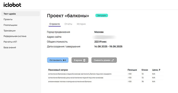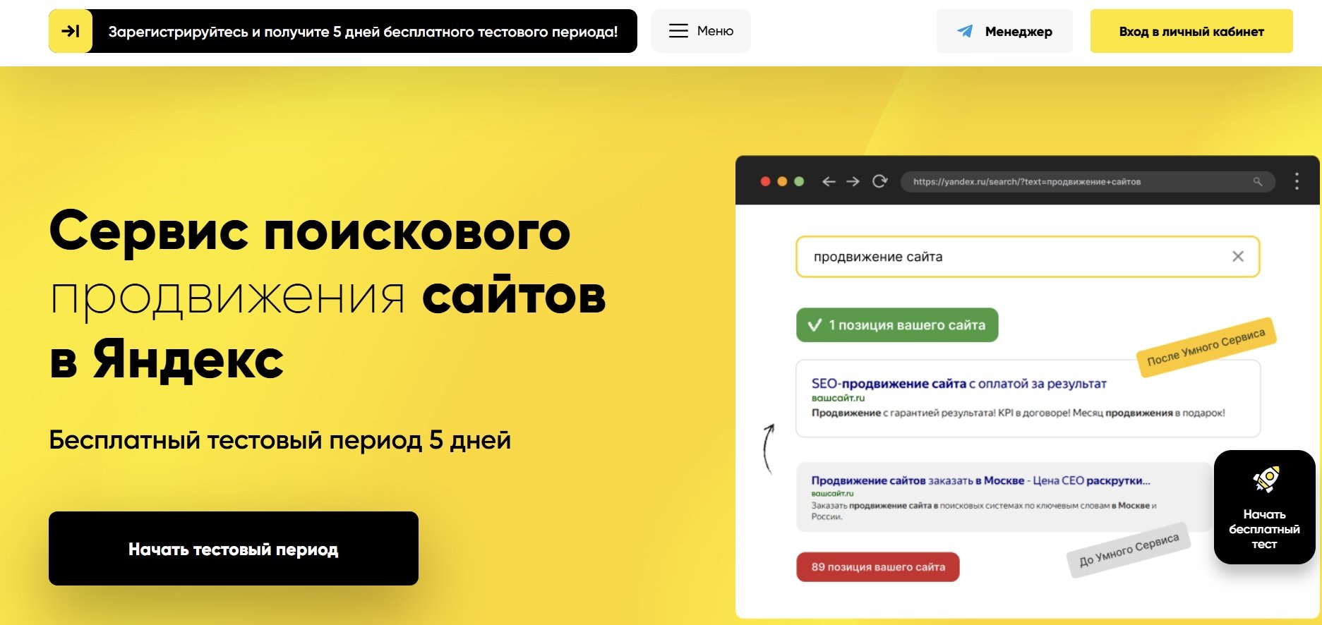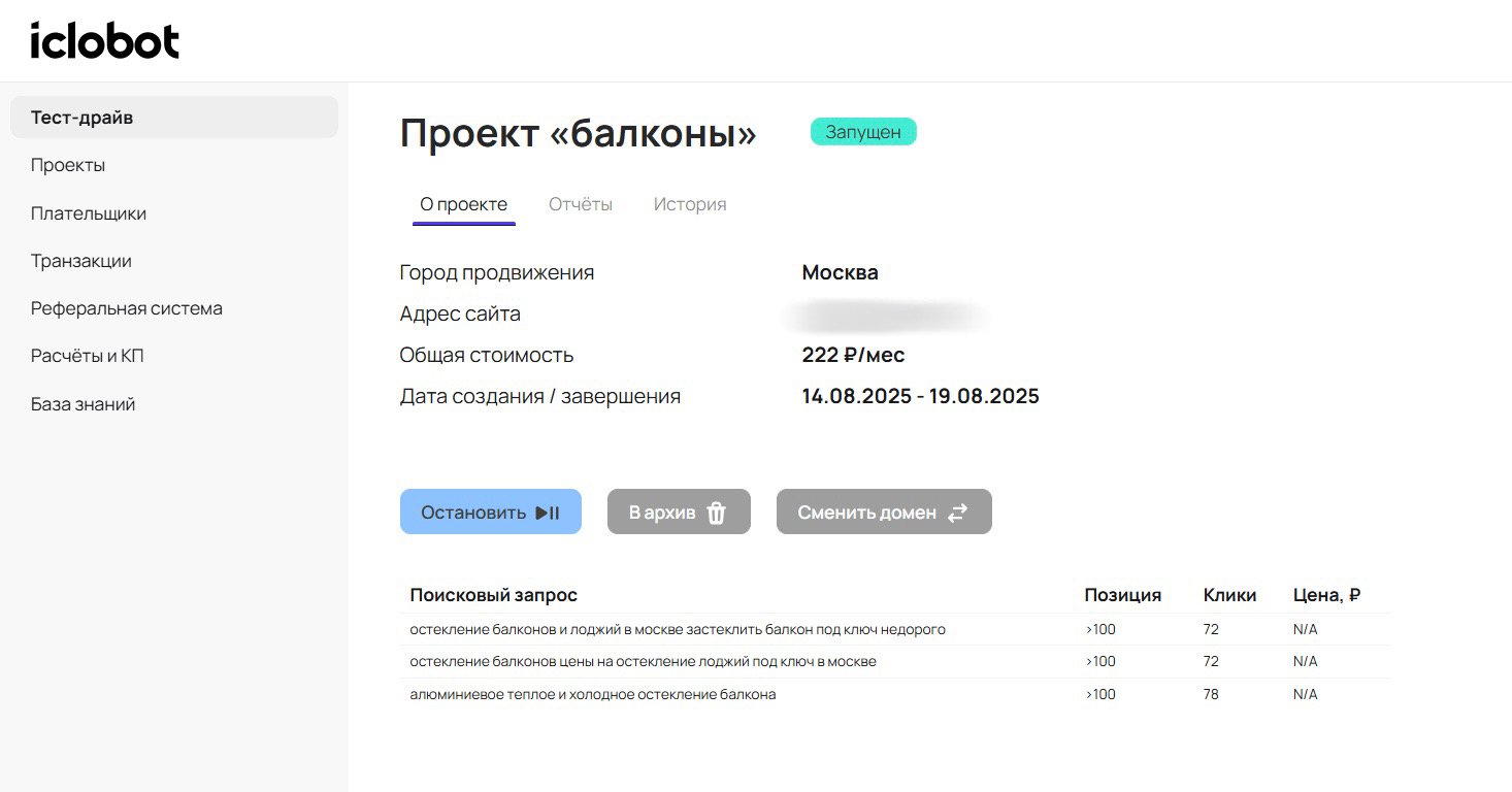 Для запуска проекта зарегистрировалась в личном кабинете и отправилась запускать тест. Понравилось, что не нужно согласовывать ничего с менеджером и куда-то переходить, без проблем запускаешь. Не понравилось, что для запуска можно было использовать не более трех запросов, входящих в топ-100 и запросы только с невысокой частотностью. Тестовый период длится 5 дней.