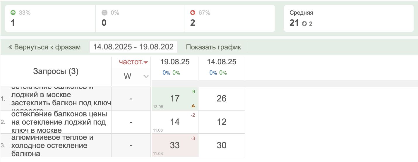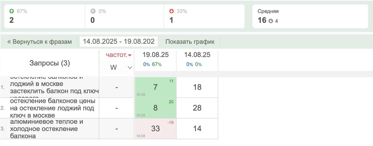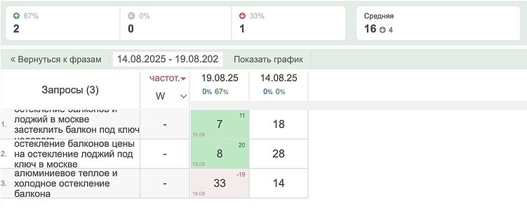 Положительная динамика только по одному запросу. Результаты неудовлетворительные.