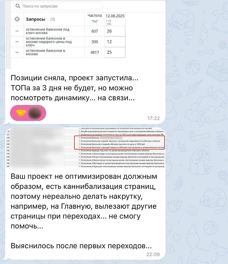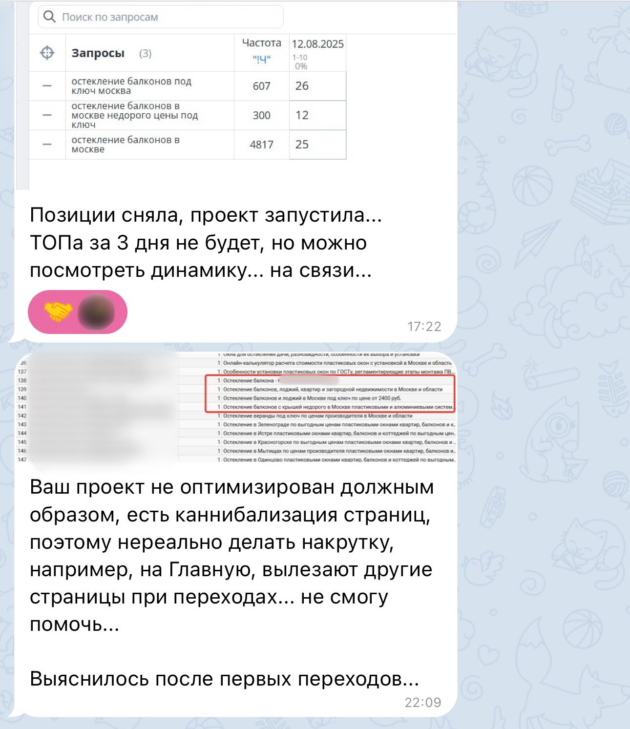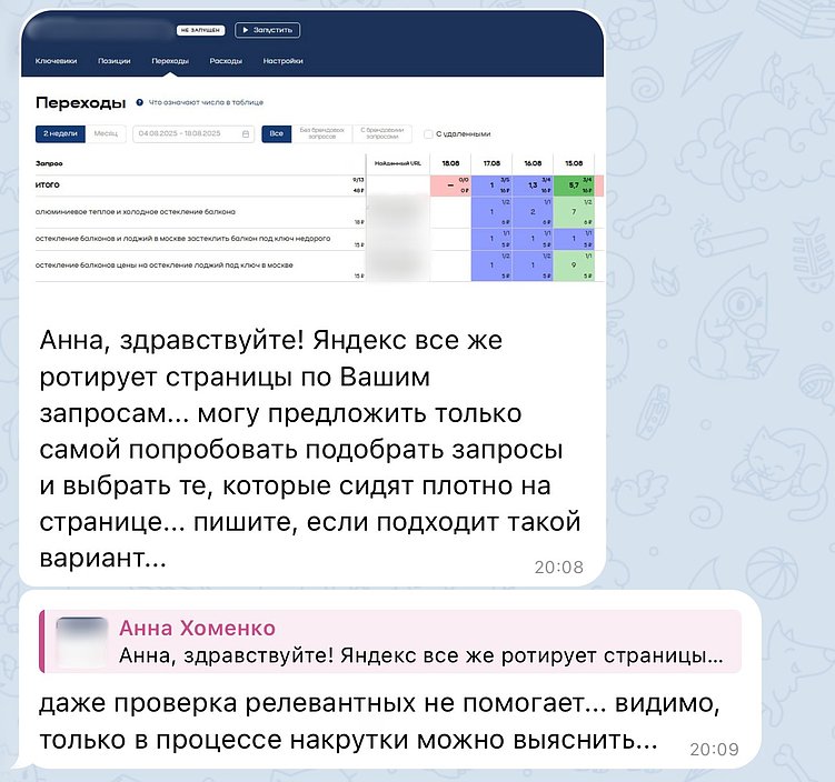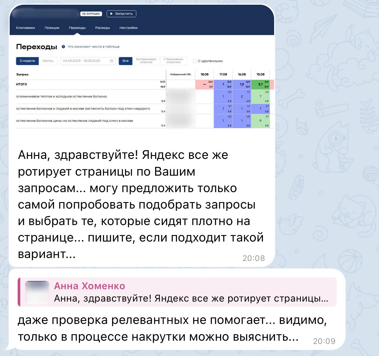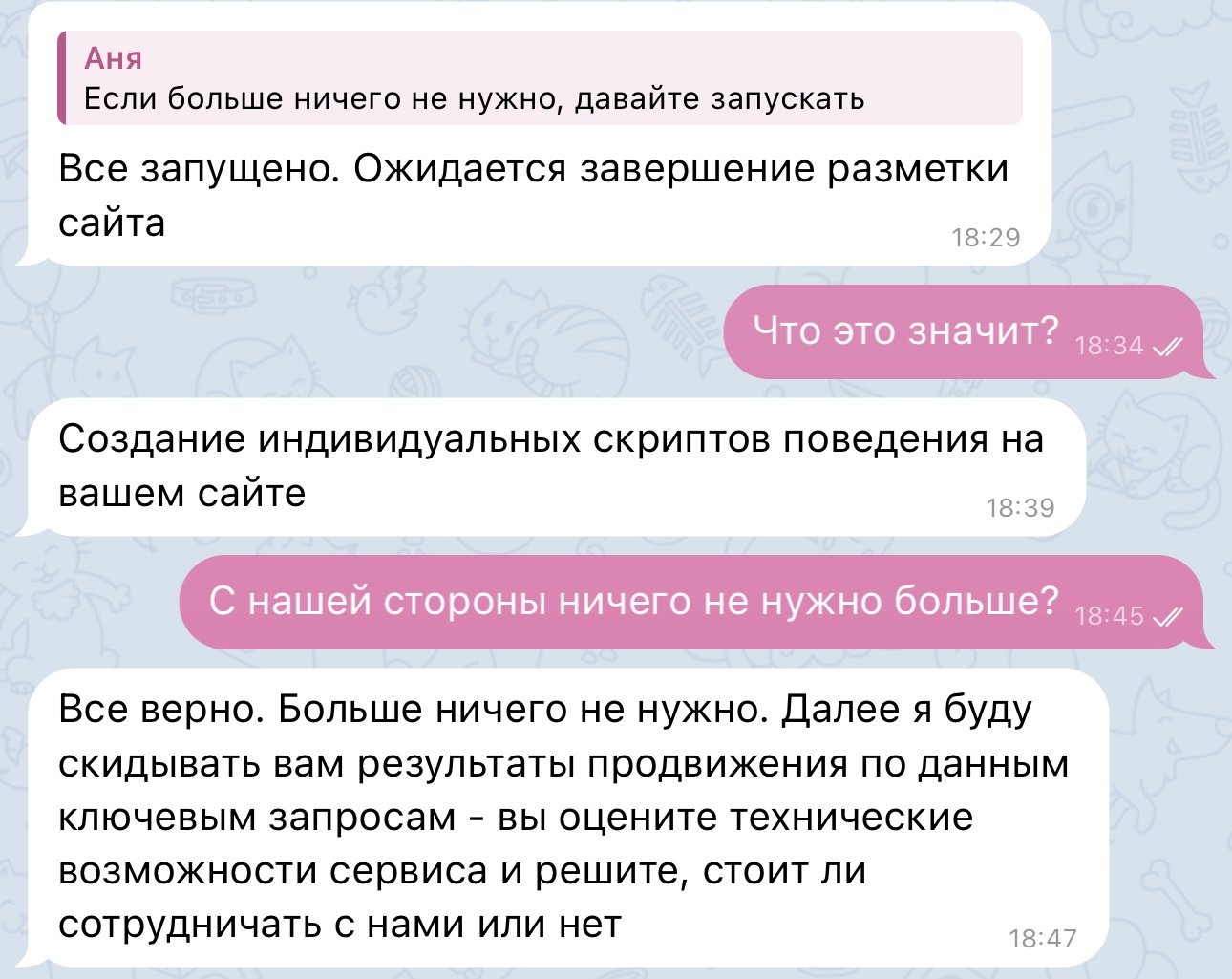 Здесь общение происходило исключительно напрямую с менеджером. Сначала я выслала на накрутку один сайт, на что мне сказали, что не получится накрутить по моим запросам, так как не категоризированы страницы. Предложила в качестве альтернативы на тест другой сайт. В итоге произошла путаница. Первый день решали накладку с одним сайтом, второй день - с другим. И уже к вечеру после долгих согласований удалось согласовать и запустить тест.