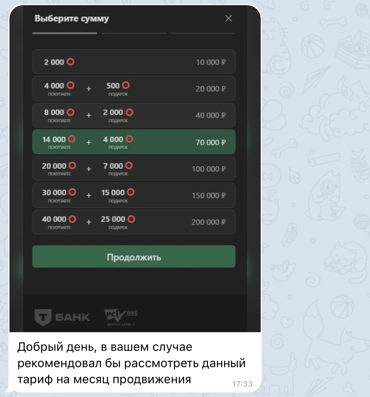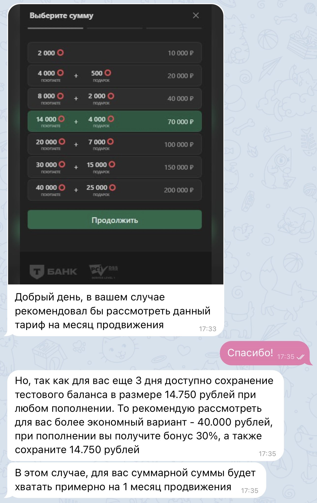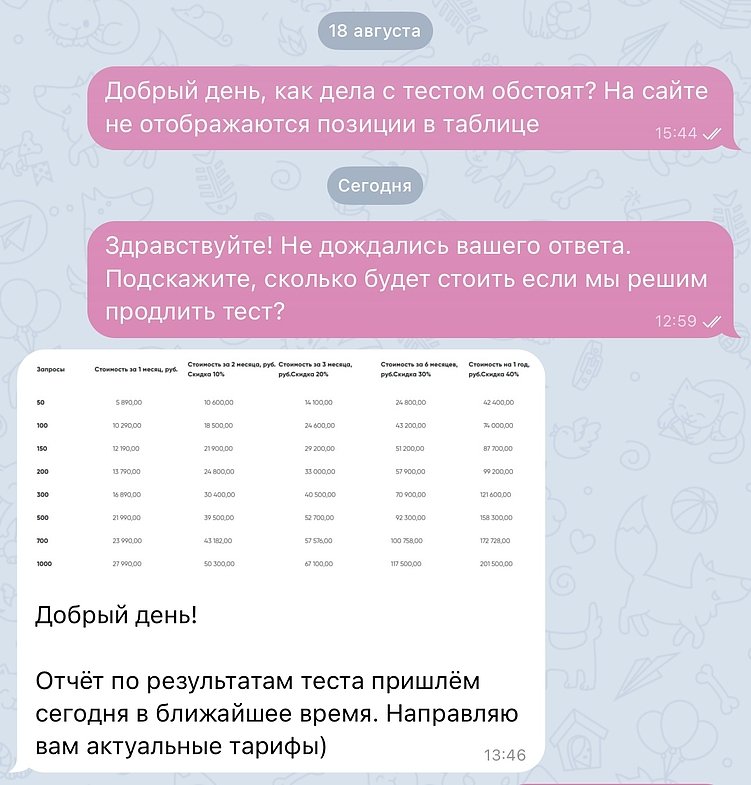 По прайсу уточнила, если хочу продлить тест, то сколько по стоимости составит: 5000 в неделю. Согласно информации на сайте, минимальный тариф старт 20.000 рублей до 50 ключевых фраз. Ниже сноска “Если у вас есть уникальные задачи, не предусмотренные в стандартных тарифах, мы разработаем для вас персональное решение”.