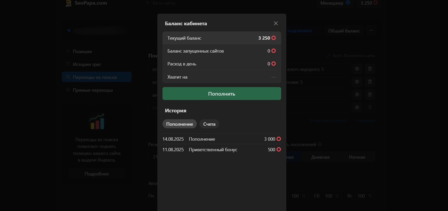 Нюанс такой: вы приобретаете валюту внутри сервиса, которая списывается только за полноценный совершенный переход на ваш сайт. В любой момент вы можете приостановить работу сервиса и баланс списываться не будет, а также тратить его на другие проекты. В качестве нового клиента, мне предоставили возможность добавления бонуса 30% от суммы первого пополнения и порекомендовали минимальный вариант пополнения 10.000 рублей (2000 бонусов). Расход бонуса происходит в зависимости от переходов на ваш сайт, за каждый переход списывается 1 бонус.